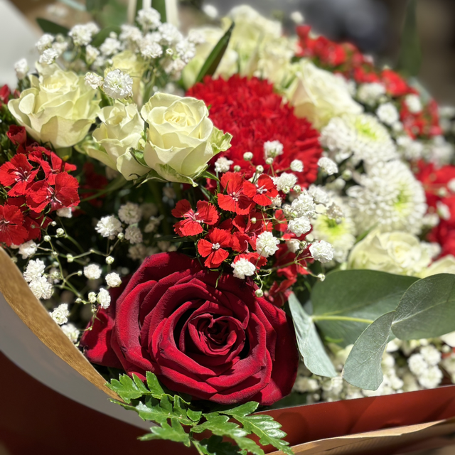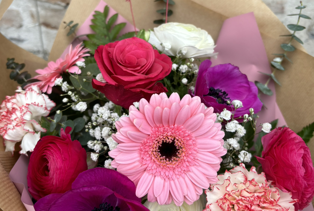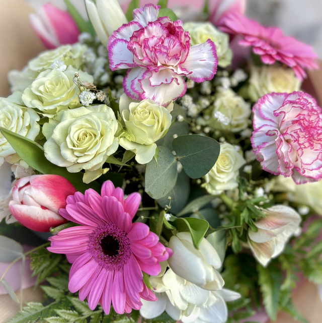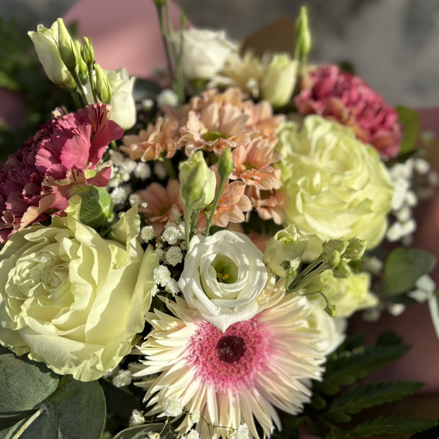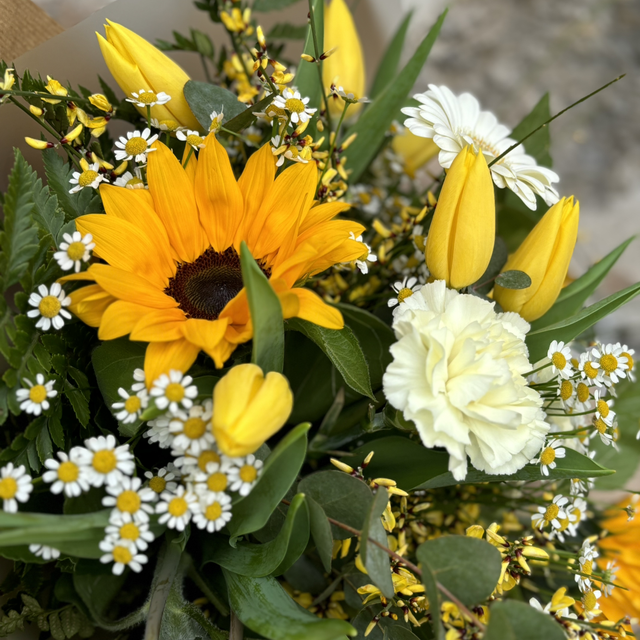 Mazzo di fiori recisi misti di stagione e fronde verdi
