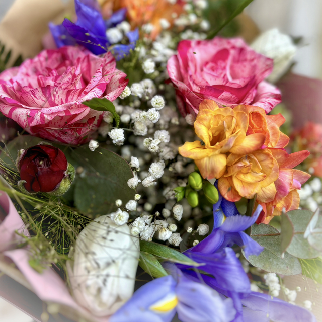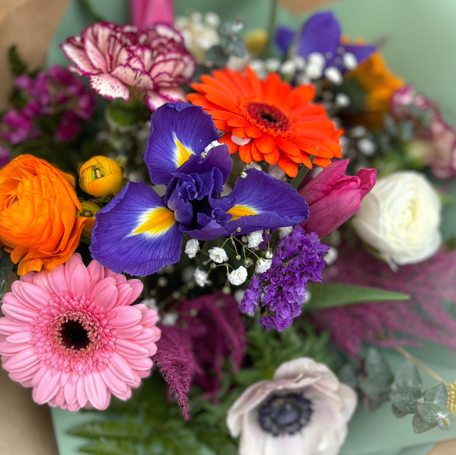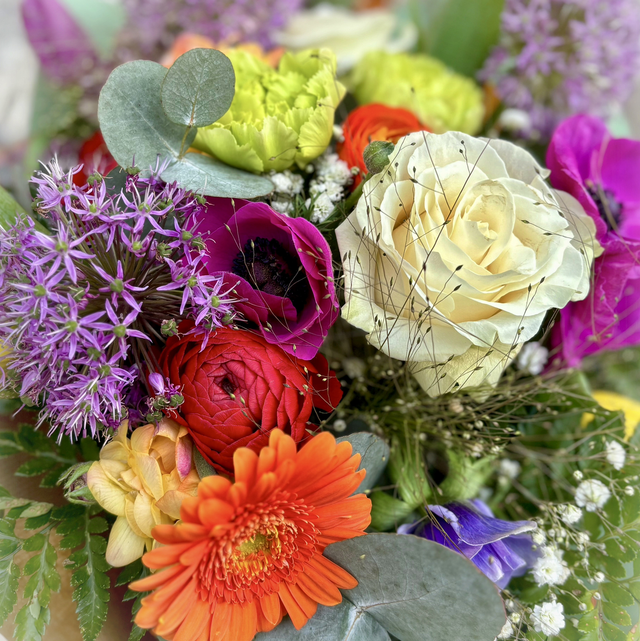 Mazzo di fiori di stagione multicolor con fronde verdi